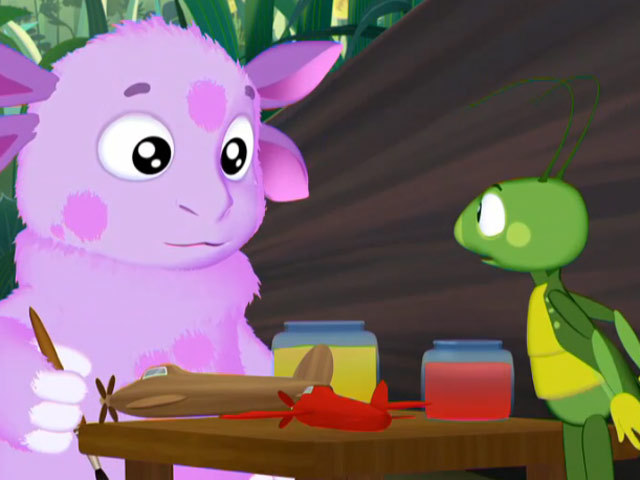 Лунтик и Кузя запускают самолетики. Но ребята поспорили из-за того, в какой цвет покрасить свои самолеты.