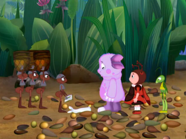 Тот, кто водит, играя в жмурки, ориентируется только на голоса и звуки. Если копировать голоса Милы и Кузи, то можно увести Лунтика подальше от друзей. Так развлекаются Вупсень и Пупсень. И приводят Лунтика на полянку, где работали Муравьи. Гусеницы быстро ретировались, а вот собирать то, что нечаянно рассыпал Лунтик, придется ему самому. Но друзья даже и не заметили, как прошло время, потому что свою работу они смогли превратить в веселую игру, где выигрывают и получают призы все-все-все. Все, кто работал. Язык: Русский